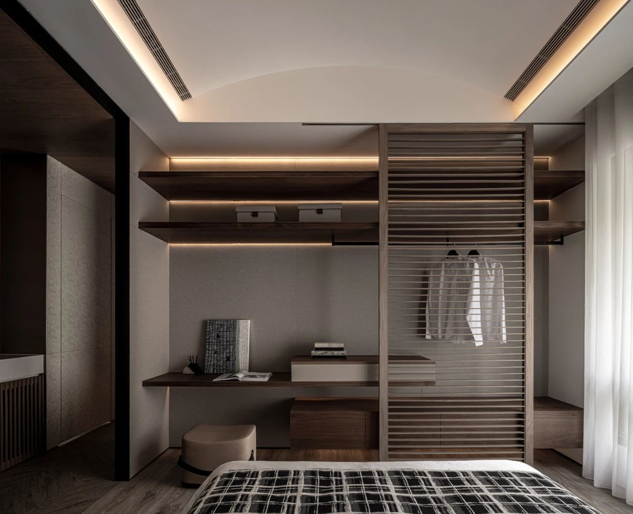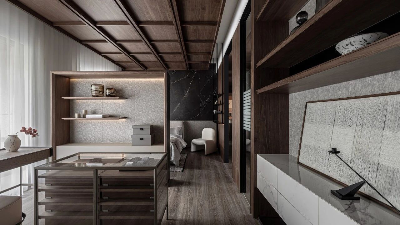 更衣室靈感汲取自精品酒店配置邏輯:獨(dú)立飾品陳列區(qū)、精心規(guī)劃的長衣懸掛區(qū)與疊衣展示區(qū),搭配兼具梳妝與書寫功能的工作臺(tái),共同構(gòu)筑了一個(gè)集高效收納與美學(xué)展示于一體的優(yōu)雅場域。