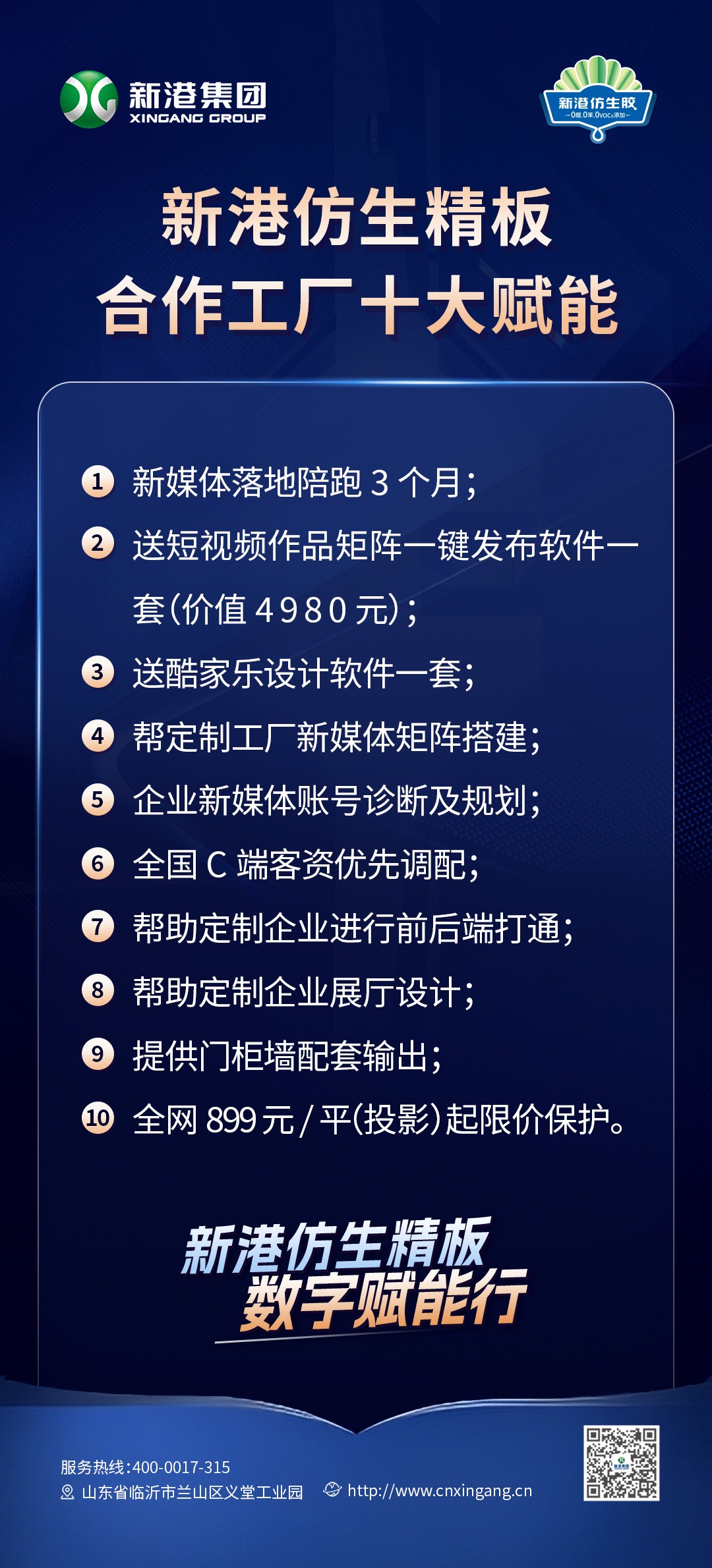 這是一場求發展與拓新局的雙向奔赴,新港集團以專業的服務,邀請同樣有強烈意向的定制工廠加入我們的行列,共同探索線上發展的新機遇,為此精心策劃了一系列具體而有力的幫扶政策——新港仿生精板合作工廠十大賦能,涵蓋新媒體運營、設計等多個方面,提供系統化、專業化的新媒體課程培訓,促使新媒體營銷躍升成為定制工廠信息傳播、流量轉化、引流獲客的重要武器,持續做好運營落地,全面提升定制工廠線上運作能力。